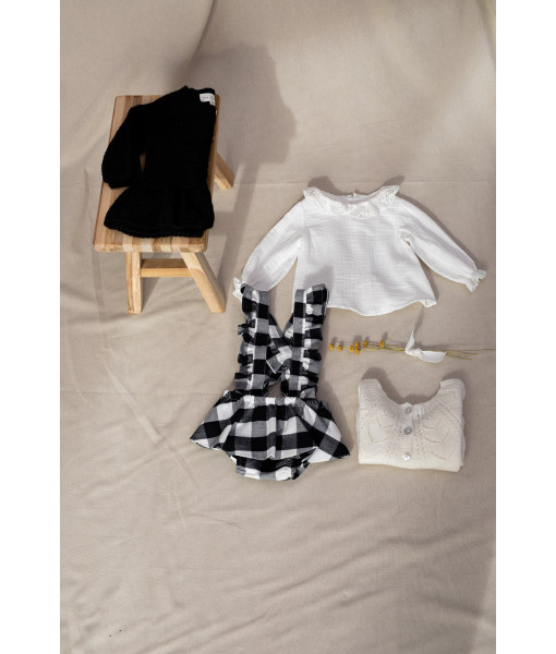 CHAQUETA, BLUSA CUELLO CROCHET Y RANITA CUADROS NEGROS