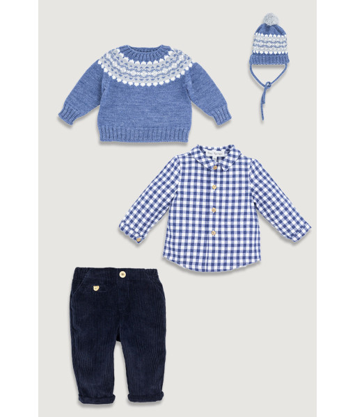GORRO, JERSEY GRECA, CAMISA VICHY Y PANTALÓN AZUL